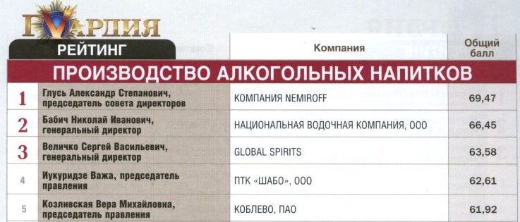 По версии «Рейтинга самых успешных руководителей Украины – 2012» всеукраинского рейтингового журнала «ГVардия» председатель Совета директоров компании Nemiroff Александр Глусь признан лучшим управленцем на рынке крепкого алкоголя, а также одним из наиболее эффективных топ-менеджеров украинского бизнеса в целом.