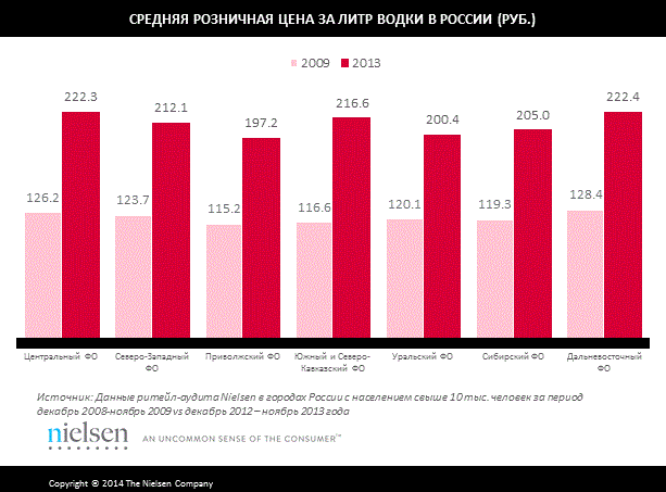 Объем рынка водки в России в 2013 году сократился на 18% в натуральном выражении по сравнению с 2012 годом и на 27% по сравнению с 2009 годом, свидетельствуют данные Nielsen, мирового эксперта в области маркетинговой информацииi. Падение рынка сопровождается ростом цен на водку: ее средняя цена в России за четыре года (с 2009 по 2013 год) выросла на 75% с 121 рубля за литр до 212 рублей.
