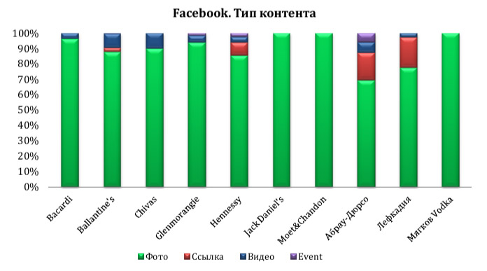 87% постов на страницах алкогольных брендов составляют фото, 7% – ссылки, 5% – видео, 1% — мероприятия. Наиболее разнообразный контент генерируют Абрау-Дюрсо и Лефкадия.