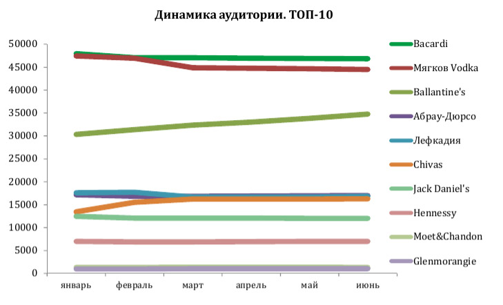 За первое полугодие аудитория большинства брендов сократилась. Заметного роста добились лишь Chivas и Ballantine’s, показавшие рост в 21% и 15% соответственно.