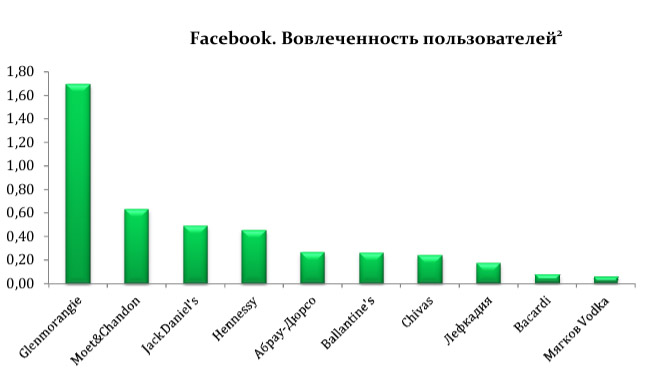 По индексу вовлеченности аудитории вне конкуренции бренд Glenmorangie (индекс=1,70). Вторую позицию занимает Moet&Chandon с индексом 0,63. Показатели большинства других брендов сопоставимы и не превышают 0,50.