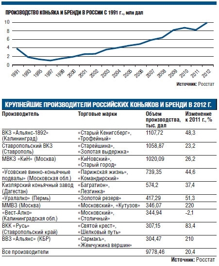 В 2012 году российские производители выпустили рекордное количество коньяка. Согласно данным Росстата, в этом году 45 российских заводов произвели около 10 млн дал этого напитка — это максимальный показатель в современной истории страны.