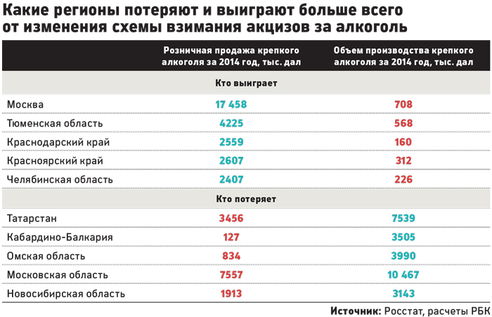 Издание РБК, опираясь на данные Росстата относительно объемов продаж и производства алкогольных напитков в регионах, подготовило таблицу, по которой можно судить об их соотношениях, а также о предполагаемом объеме возвращаемых акцизных доходов: